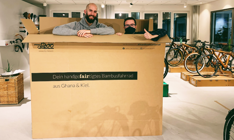 Unsere Rahmen sind aus einem nachwachsenden Rohstoff – das ist relativ offensichtlich. Aber auch der Transportweg von Ghana ist kürzer als der eines konventionellen Rahmens aus z.B. China. Unsere Versandkartons sind aus Pappe und wir verschicken fast 100% plastikfrei. Zusätzlich nutzen wir möglichst nachhaltige Komponenten wie Scheinwerfer mit kompostierbarem Gehäuse, Handgriffe aus Birkenrinde oder faire Reifen aus Naturkautschuk.